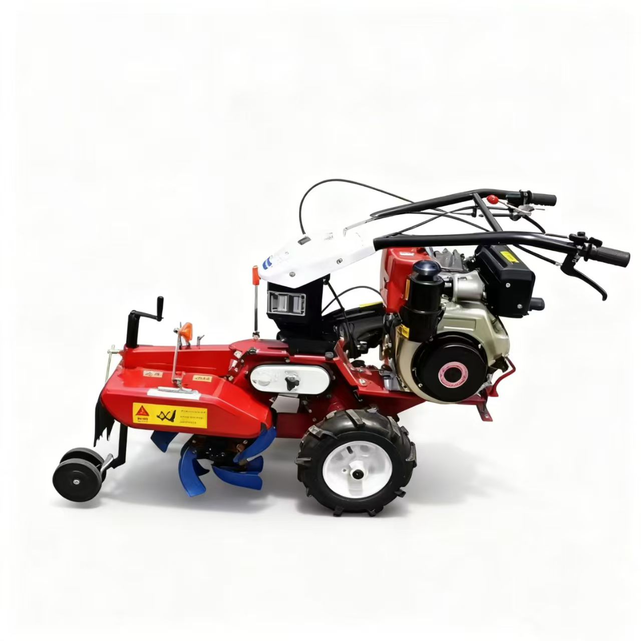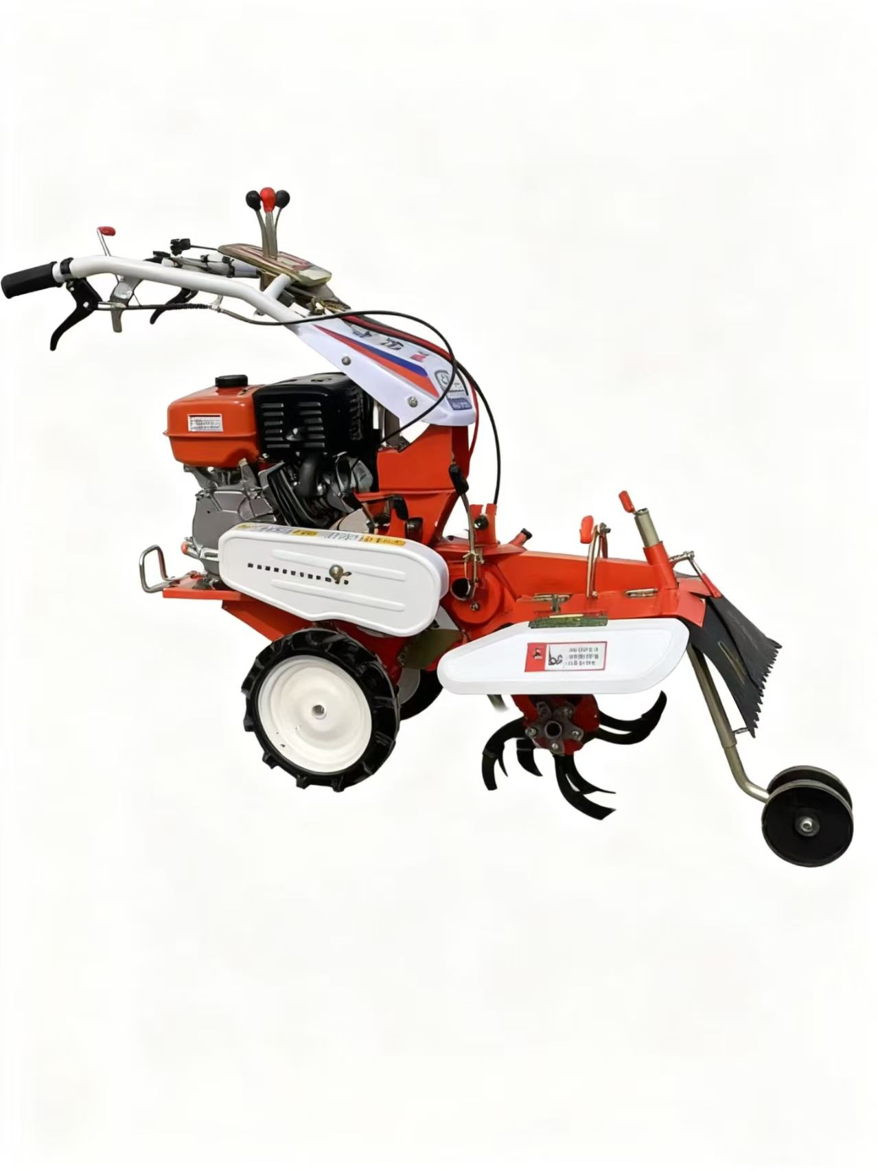 - 프레임 및 컨트롤: 접이식 핸들바가 있는 경량 강철 프레임. 핸들바에는 스로틀, 클러치 및 기어 레버가 통합되어 있어 한 손으로 조작할 수 있어 좁은 농작물 줄 사이를 쉽게 이동할 수 있습니다.